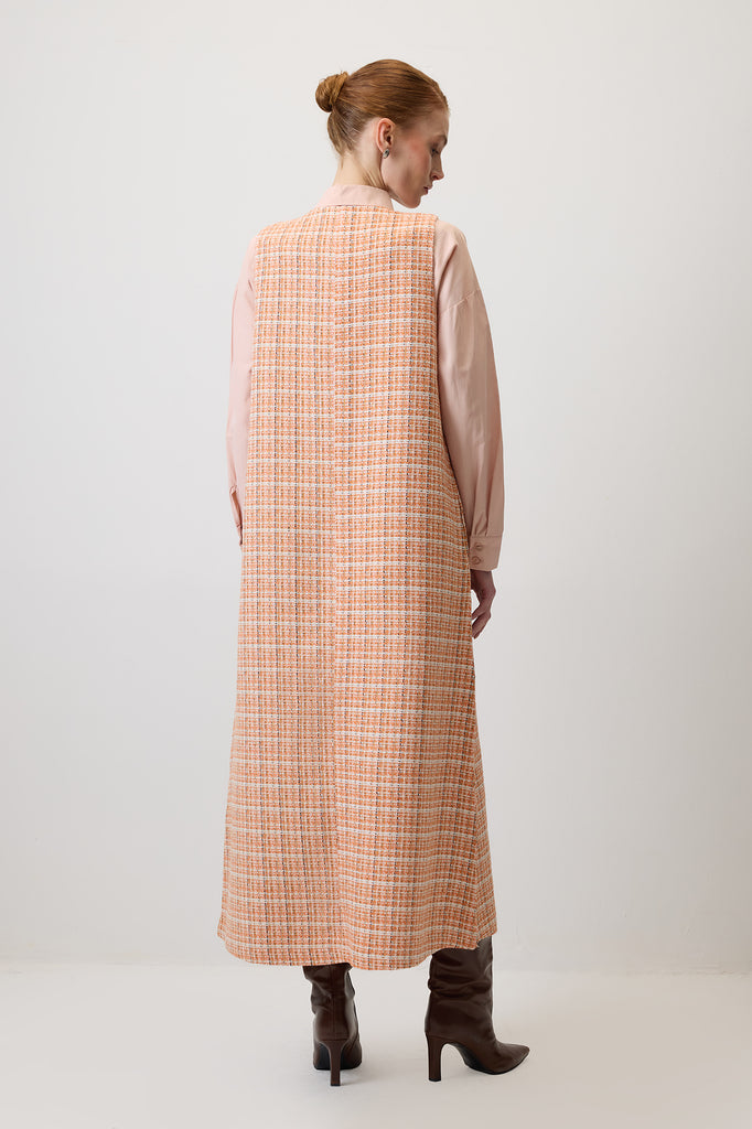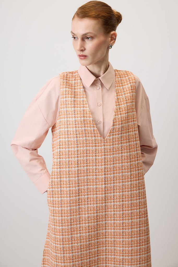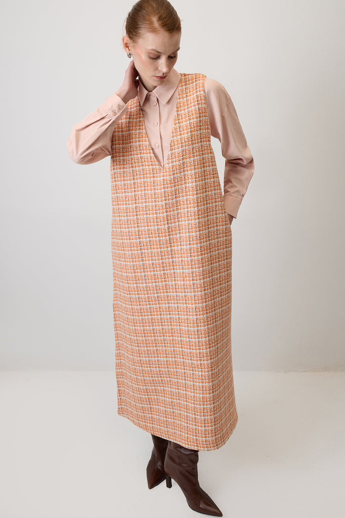 TWEED CHECKED V-NECK PINAFORE DRESS