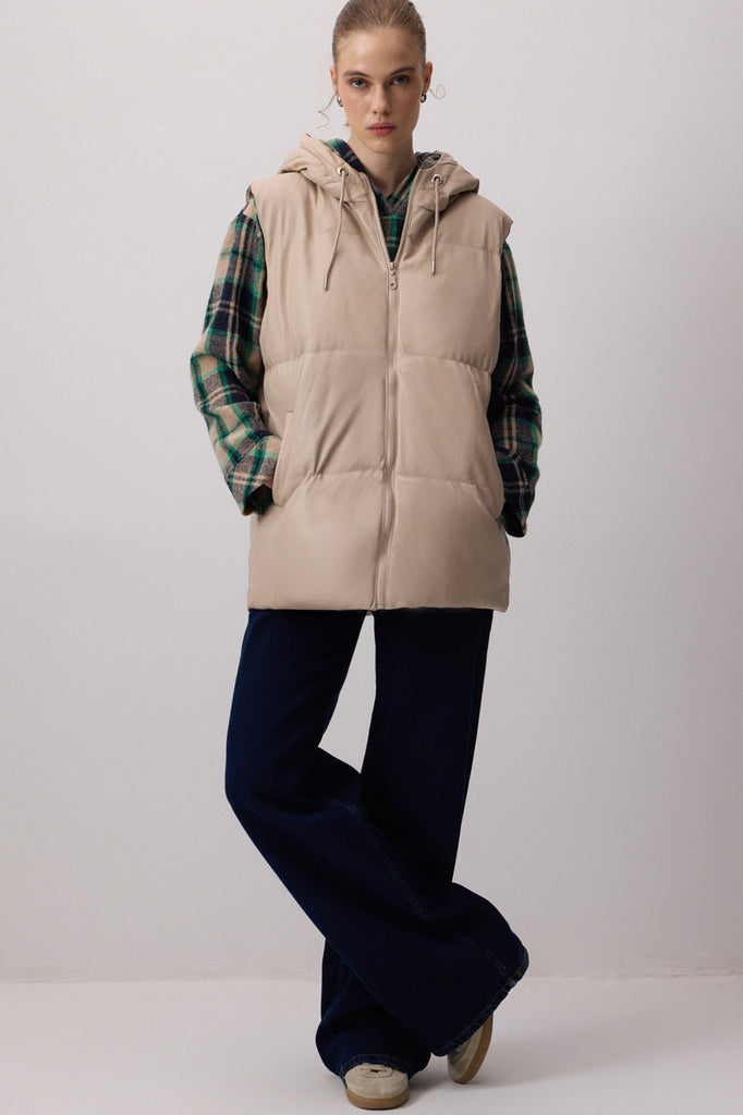HOODED PUFFY LEATHER VEST